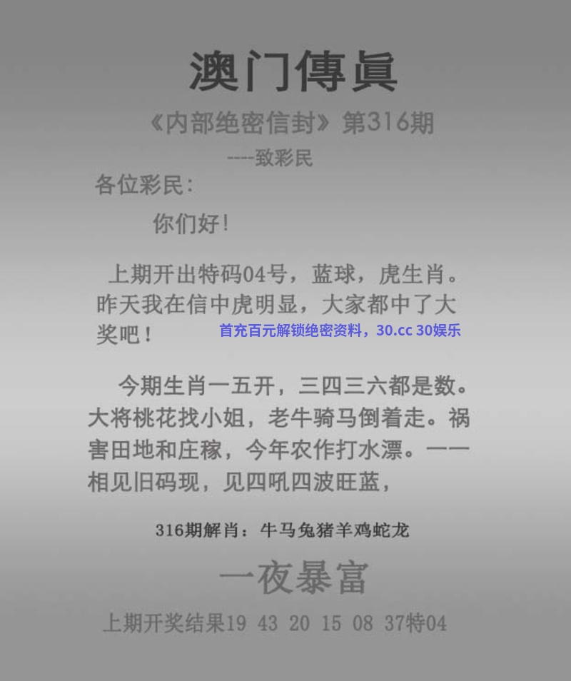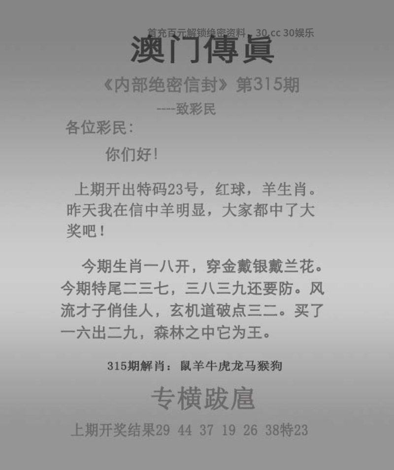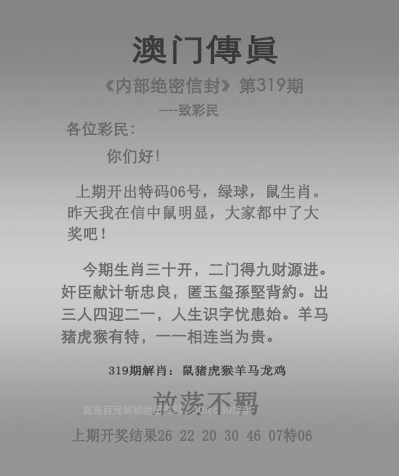 | 315期:独解传真 解:今期生肖一八开,穿金戴银戴兰花。今期特尾二三七,三八三九还要防。风流才子俏佳人,玄机道破点三二。买了一六出二九,森林之中它为王。 送:鼠羊牛虎龙马猴狗 |
