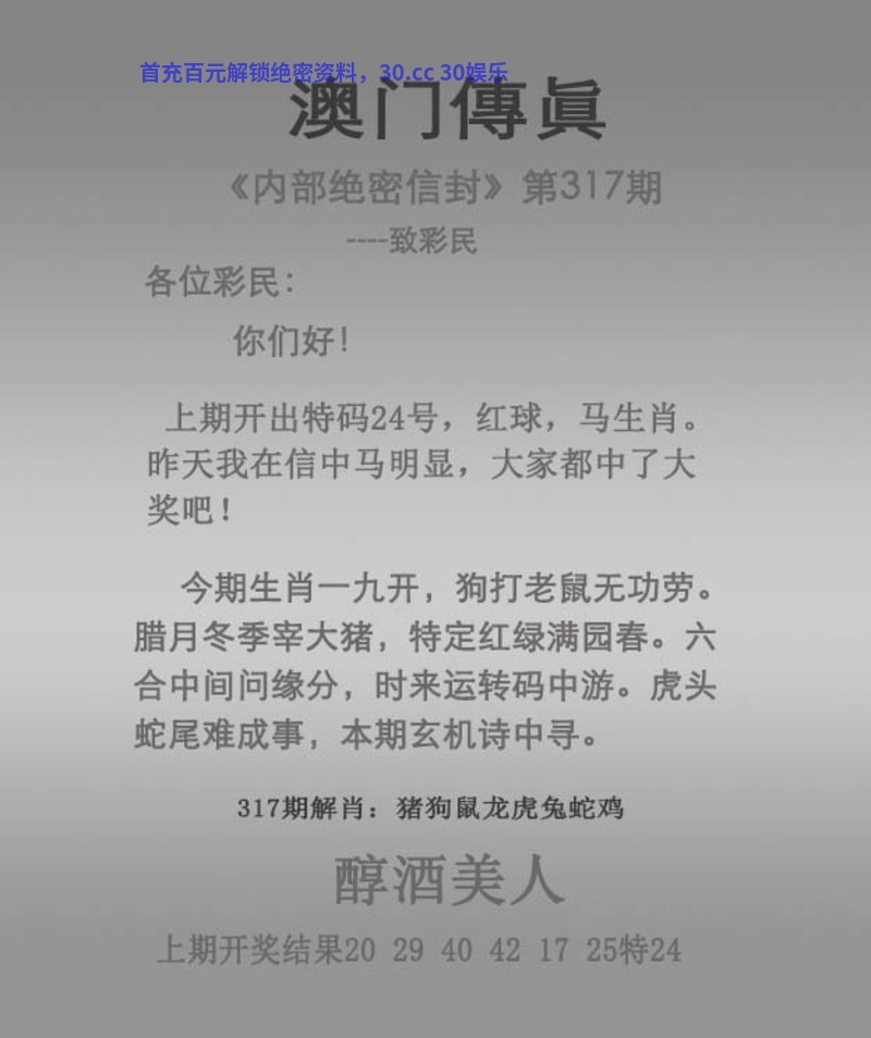 | 313期:独解传真 解:今期生肖一六开,牛来本期看四九。画蛇添足反类犬,绿波有望出旺码。春色红梅香万树,时享运到获大财。四七相加二四合,向上三期博六合。 送:虎牛蛇狗龙兔马羊 |