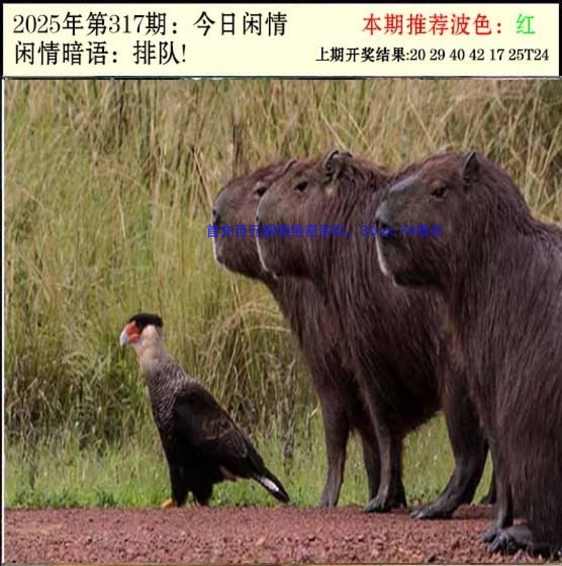 | 317期:今日闲情暗语:【排队】 解:图中是地上站着一只鸟和卡皮巴拉,解地肖蛇羊鸡狗鼠虎 送:牛兔鼠马龙蛇 |